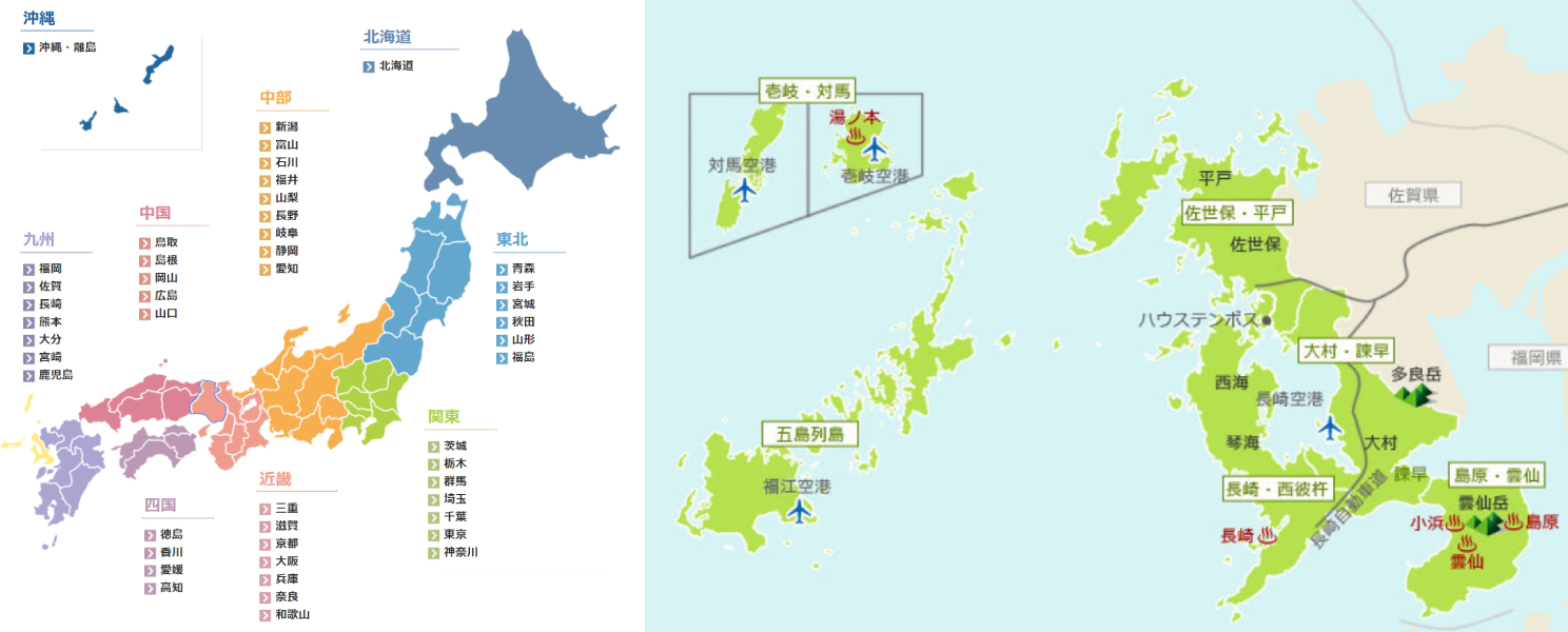 長崎位處日本的九州地區,東邊鄰近佐賀、福岡,南邊則有熊本。而長崎地區內的長崎市、佐世保、雲仙等都是知名的觀光地區。